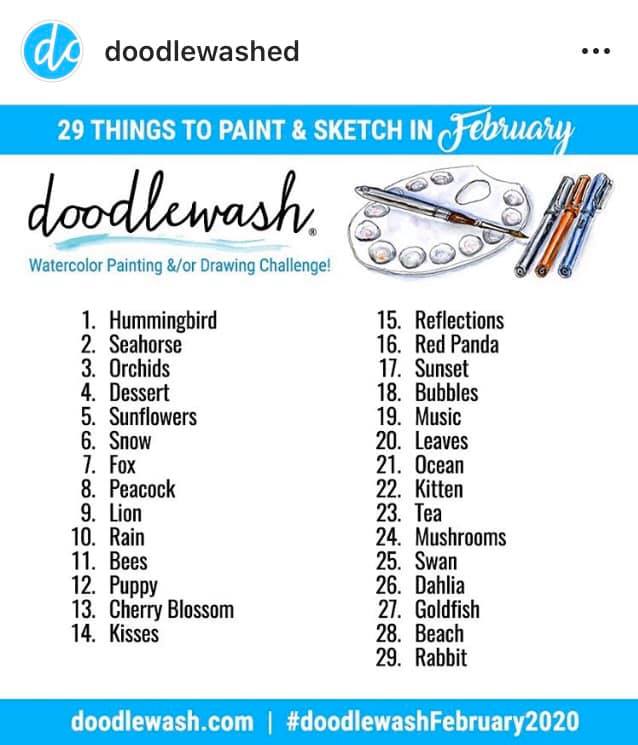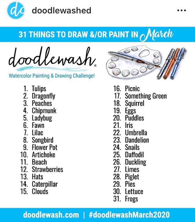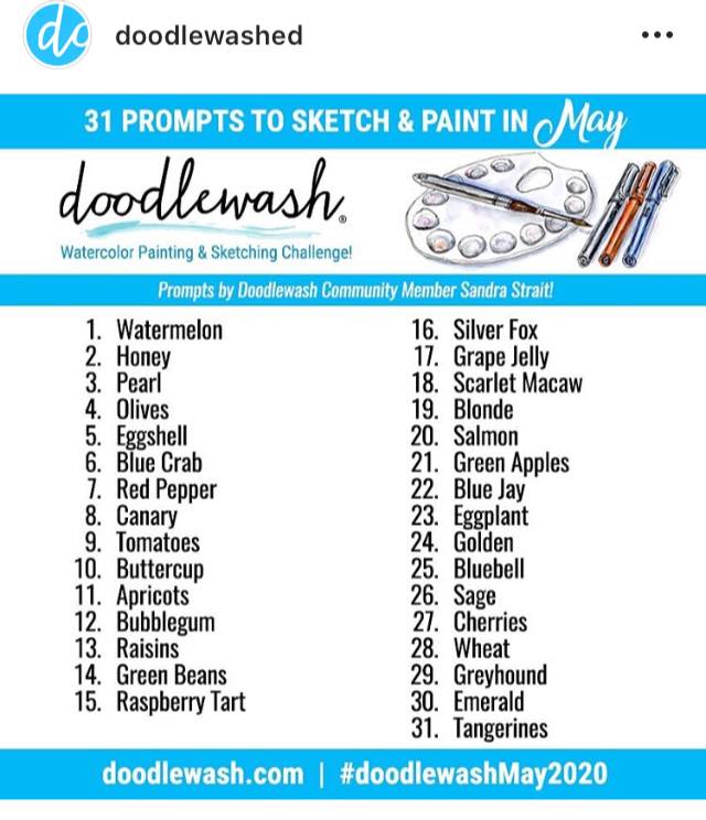 Prompt list from Doodlewash to do watercolor for March 2020. No particular order.