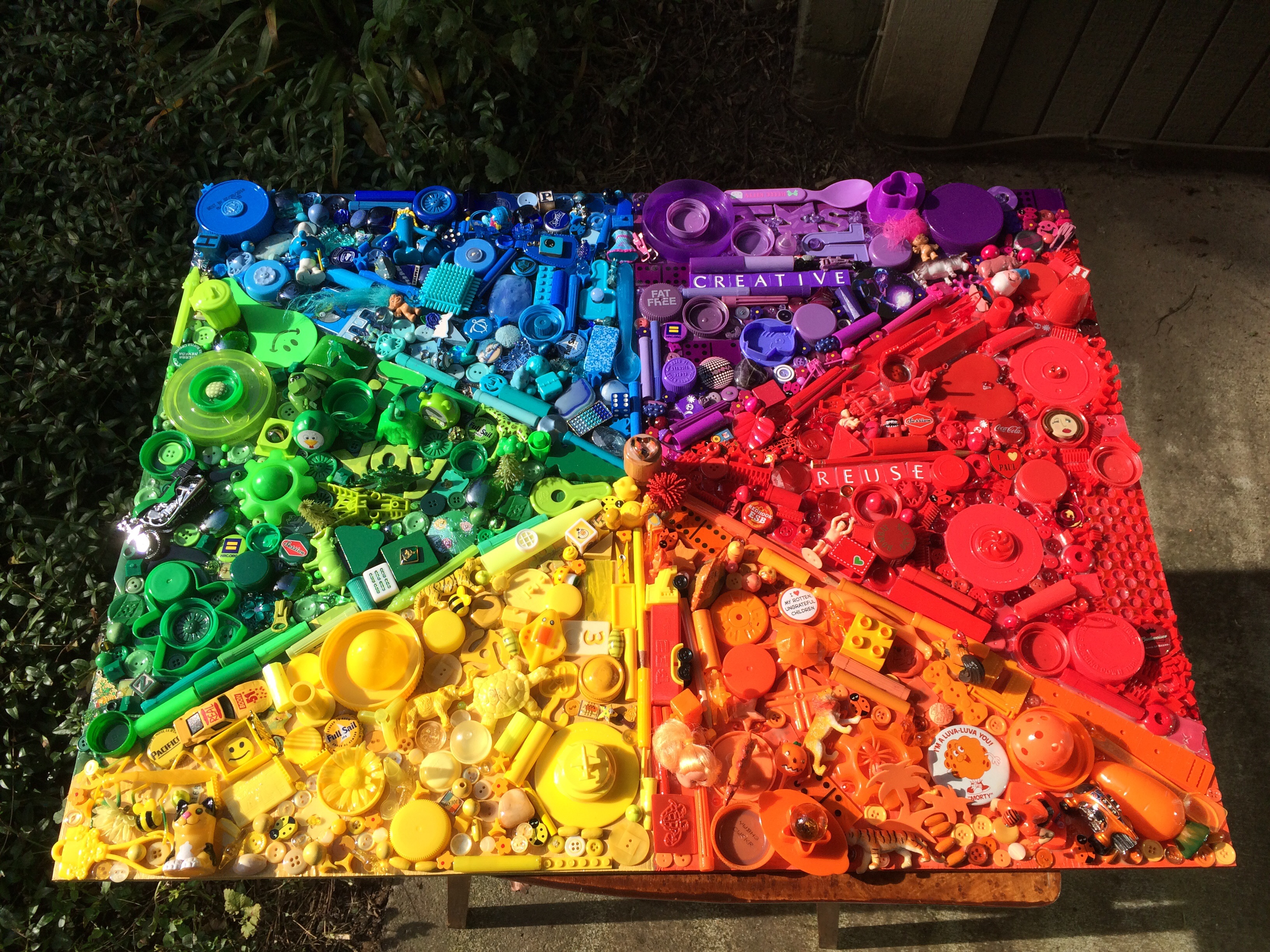 After seeing the the empty wall at SCRAP, I decided it was time to create an ultimate creative reuse found objects collage. I collected small bits, toys, caps, lids, buttons, etc. and sorted them by colors of the rainbow. After gluing all of my pieces on, and finally coating with a clear coat to prevent dis coloring. I delivered it to SCRAP tonight at their new location on SW 18th and Alder in Portland, Oregon. The piece is 24″x34″ approximately.